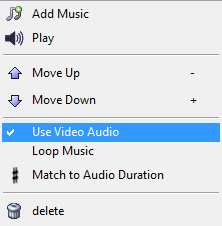 - In the music listcontrol the right click menu has a new function called 'Use Video Audio'. If this is checked music will fade in and out around videoclips in the slideshow and if it is unchecked the music will be played over video clips too and no audio from the videoclips will be heard.