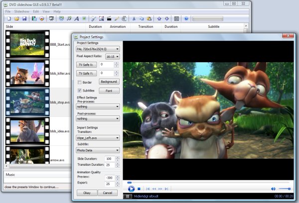 - Avi and avs can now be animated(Ken Burns), overlapped(negative transition durations), overlayed(a transition for adding new slide on top of the old one) and subtitled. A preview image will be visible in the listcontrol/Slidesettings window/Animation window. In other words videos can be handled like slides now whithout the previous limitations.