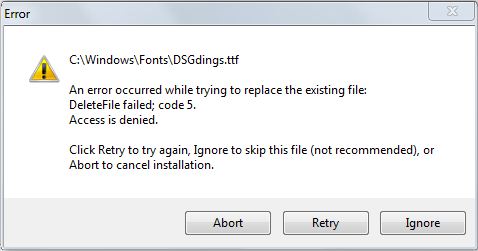 The error remains, I believe did not previously have that font. The manual install is very simple. I don't see this as a major problem so long as new friends can gain access to the font and drag it into the fonts folder. http://dl.dropbox.com/u/21985720/DSGdings.zip