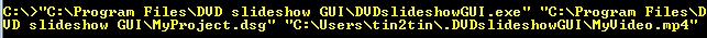 "C:\Program Files\DVD slideshow GUI\DVDslideshowGUI.exe" "C:\Program Files\DVD slideshow GUI\MyProject.dsg" "C:\Users\tintin\.DVDslideshowGUI\MyVideo.mpg"