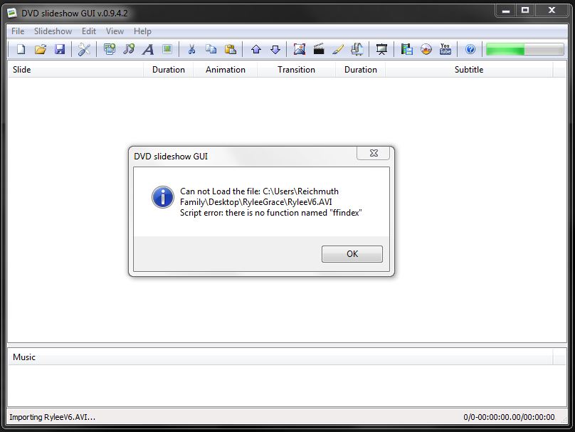 I apologize ahead of time if this is the incorrect thread to post issues with DSG, but I'm having a problem every time I try to import an AVI file and I'm not sure if it's a bug or just an issue I'm experiencing. Here is the error I receive: