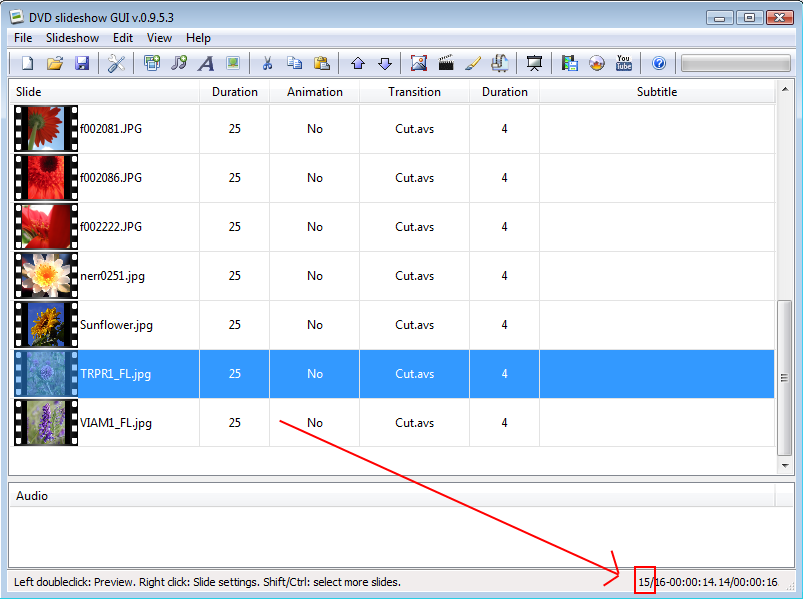 The time of the selected slide will be shown out of the total duration. Ex. 00:00:19.00/00:00:57.00 means the selected slide will be shown 19 sec. into a slideshow with a total duration of 57 sec. -
