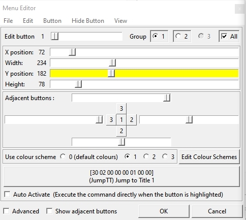When you use the cursor of the remote to move from a button to another button, the button you will reach when using, say, the right arrow is the button selected by the slider in the right part of the adjacent buttons frame of the Menu Editor. (In your example, it will be button number 2, reachable also with the down arrow. The left and up arrows select button 3.) When you change the numbers of the adjacent buttons, there is a risk to create a dead end (for example if button 1 is linked to button 3 only, and button 3 to button 1 : it will be impossible to reach button 2.) It's why you have to verify if all buttons are easy to reach with the remote. (In the PGC Editor, you can select any button, then use the arrow keys on the keyboard to check the links. They mimic the arrow keys of the remote.)r0lZ - PgcEdit homepage Hosted by VideoHelp (Thanks Baldrick)