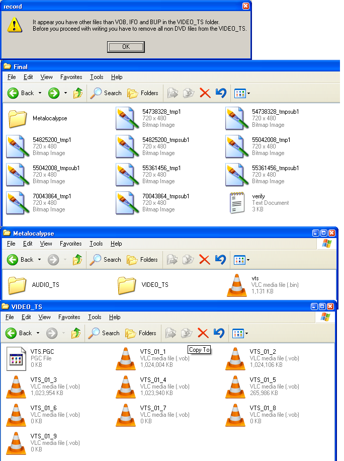 My problem comes when I try to burn. I keep getting an error that there are files other than the .vob, bup etc in the video folder. There is a VTS.pgc file in the folder and in the folder above it there is a .bin file and then I have my menu bmps.