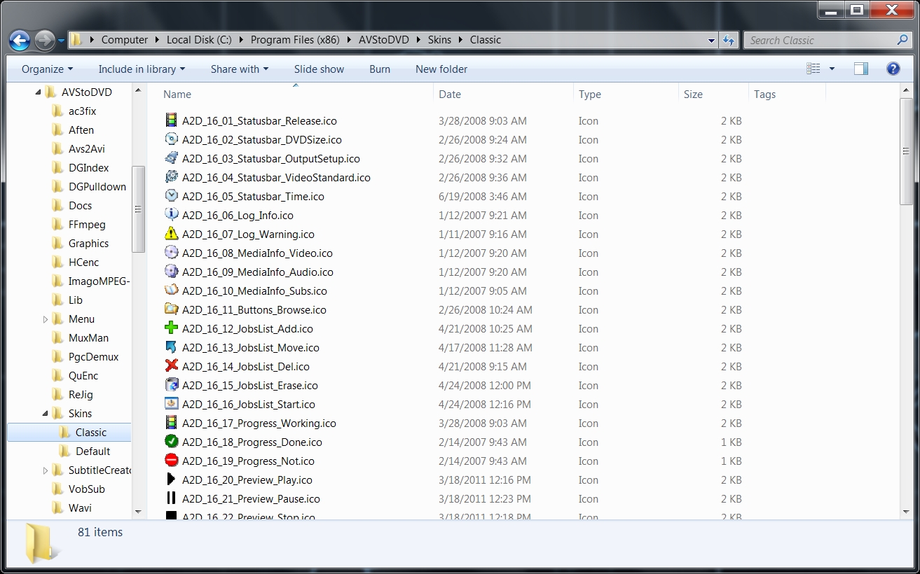 BTW I have left the .7z file containing all the original .ico files. But AVStoDVD does not unzip the .7z at runtime, it uses the resource dll. If the icons.dll file is not found, then AVStoDVD checks if there are old .ico files. That's why when you have extracted the .ico files, you fixed your issue.