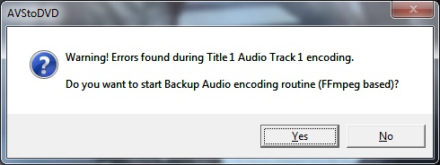 First I want to say thank you for creating this wonderful free gift! I am grateful for your generosity and I hope your good karma returns to you a thousand fold. The video quality is excellent! I am having an issue with the audio, however. I am getting an error “Warning! Errors found during Title 1 Audio Track 1 encoding. Do you want to start Backup Audio encoding routine (FFmpeg based)?" I have tried 8 different MP4 files and they all result in the same error. I am grateful the new version no longer stops and waits for me to answer the question and automatically proceeds. Before I would go to sleep for 8 hours and awake with the program waiting to be answered. I have tried QuEnc CBR 1 pass, HCenc VBR 2-pass, Audio AC3 Wavi+Aften, FFmeg+Aften. I’m not sure what to try next. I suspect when it has audio problems it takes longer because it has to do the work twice? Thank you for any advice! Here is my log file: -