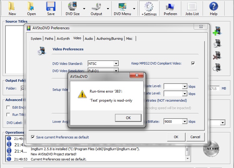 about the runtime error 383, when you select one of the Video Profiles in 'Preferences'/'Video', AVStoDVD load the bitrates levels from the AVStoDVD Windows Registry Key. It may be that the AVStoDVD regkey in your system is messed up. Just use the menu command 'Option'/'Restore Default Preferences' to reset the AVStoDVD regkey. You should not get the error 383 anymore.