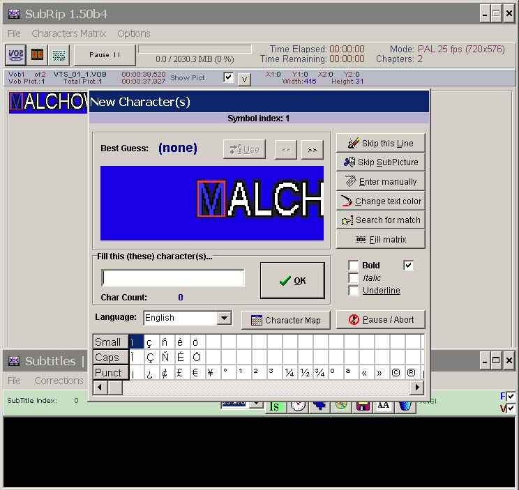 Just to elaborate a bit because that previous post came off sounding a bit condescending, I already had a character matrix for it and only had to type once, a 'TT' that had run together and wasn't in the matrix. My SubRip is version 1.50b4, which isn't the latest, I don't think. Your problem probably wasn't the spacing, because they seem very much like other subs I've seen. The problem for you was probably the colors. When you get problems like that (seeing words and not individual letters), it's often a good idea to hit "Change Text Color" and look for a different color or color combination that starts spitting out individual letters. I'll include what I was seeing in a pic, and I would guess it's different from what you were seeing. To duplicate it, hit "Change Text Color" and check only the white color: