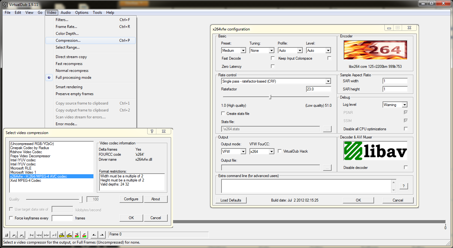 - uses VfW and ACM codecs (for AAC audio install fccHandler's AAC ACM Codec, for AVC video we can use x264vfw or ffdshow VFW),