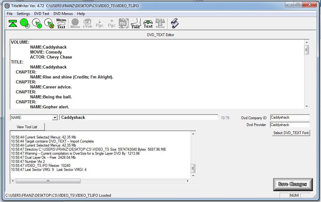 The file from the Caddyshack E_mail is fine DVD_TEXT segment is present and verified