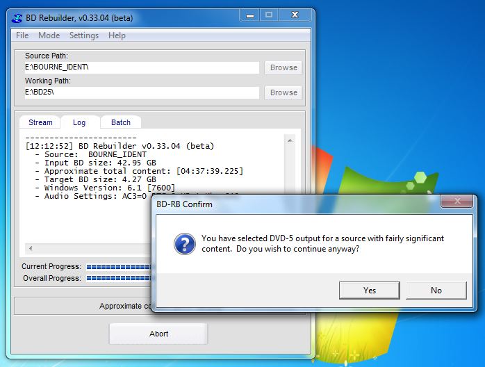 Good deal, mrswla. Your example that repeats the error I was receiving, and further info in the post, confirms fritzi93's estimation of probable causes. Your method for backing up to BD-25 (25GB) appears simplified from the guide's method. Thanks for the input. I have been successful in the rebuild from BD-50 to BD-25 using the guide, so yours should serve quite well. I'll give the Bourne Identiy backup a try with this method, although my final goal is to save money by using DVD DL media in place of BD SL media.