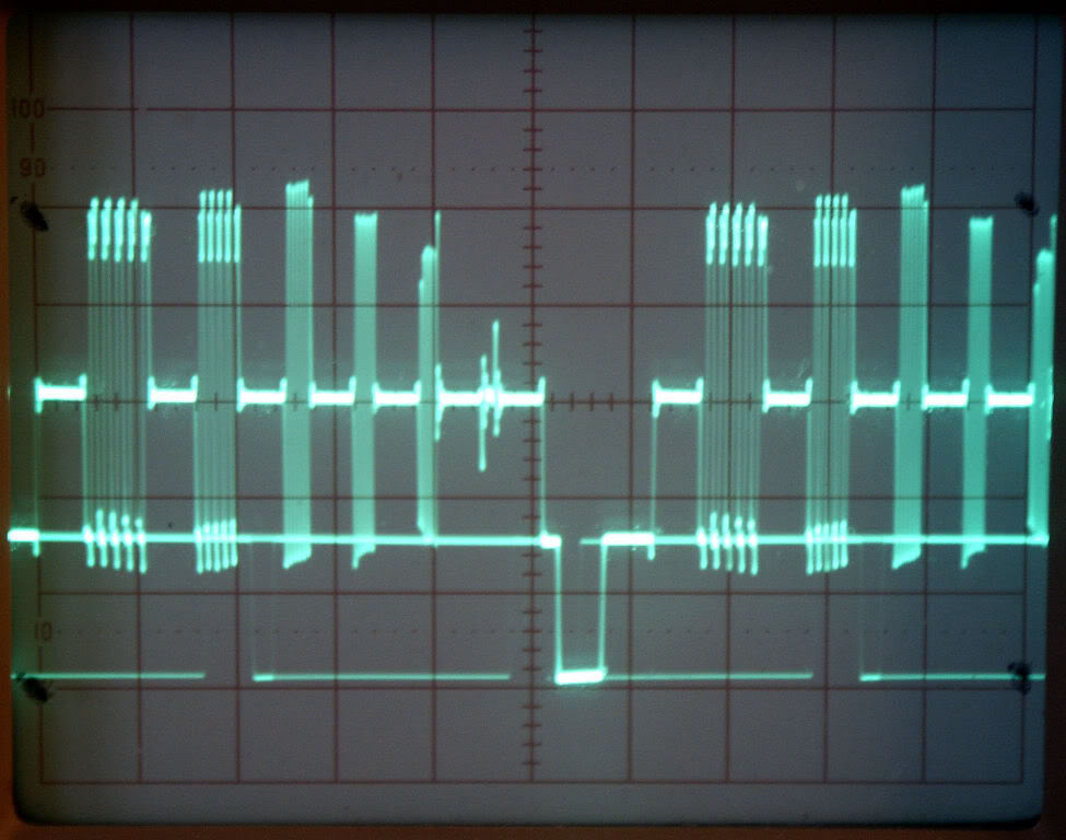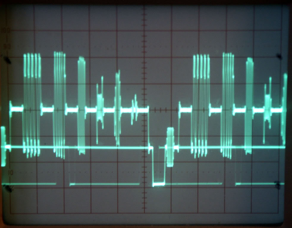 Using a B&K 1253 portable signal generator and a plain oscilloscope, here are screen shots of a multiburst pattern. The packets are not the standard they normally are. They are as follows; .75, 1.125, 2.25, 3.375, 4.5 and 6.75 MHz. All are visable, but the last packet in the shot from the 57" DLP they were viewed on (S video in) is nonexistent.