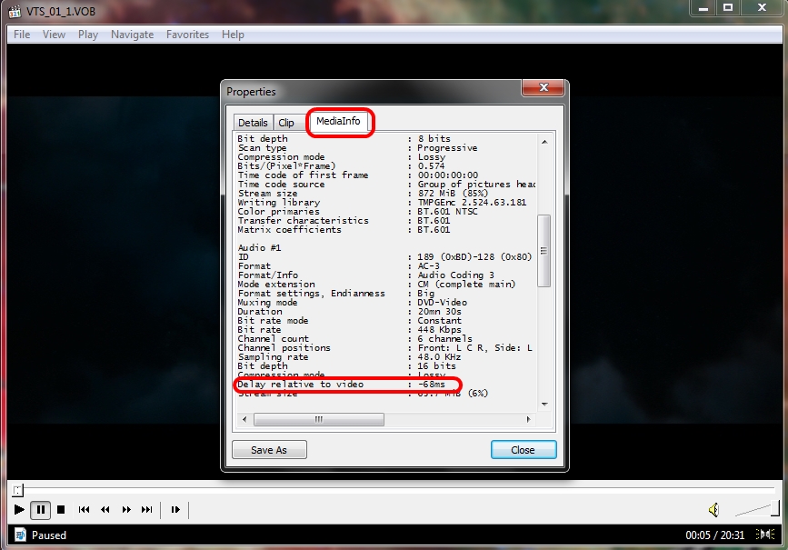 3. Click on the MediaInfo tab, scroll down to Delay Relative to Video, which in this case is -68ms (milli-seconds)