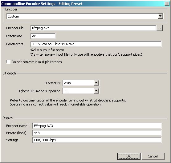 Command line: -i - -y -c:a ac3 -b:a 448k %d