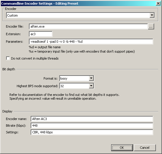 encoder\Aften.exe -v 0 -b 448 -m 0 -readtoeof 1 -cmix 0 -smix 0 -dsur 0 -dnorm 31 -dynrng 5 - "E:\sound.ac3"