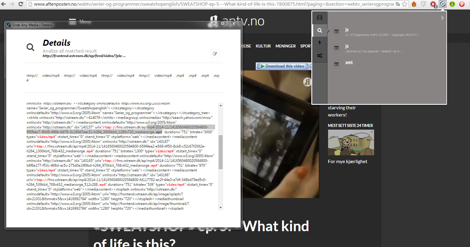 Code:rtmpdump -r rtmpdump -r "rtmp://fms.xstream.dk:1935/ap" -a "ap" -f "WIN 16,0,0,305" -W "http://frontend.xstream.dk/ap/resources/swf/standardPlayer_6.14.7.swf" -p "http://www.aftenposten.no/webtv/serier-og-programmer/sweatshopenglish/SWEATSHOP-ep-4---The-large-chains-are-starving-their-workers-7800868.html?paging=§ion=webtv_serierogprogrammer_sweatshop_sweatshopenglish" -y "mp4:mp4/2014-11/1416560802092290500-7508f519-4431-41d9-b12b-e952ed799132-h264_3000kbit_1280x720_medianorge.mp4" -o "SWEATSHOP-ep-4---The-large-chains-are-starving-their-workers-7800868.flv"