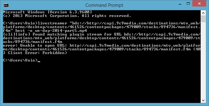 Code:livestreamer "hds://http://capi.9c9media.com/destinations/mtv_web/platforms/desktop/contents/461526/contentpackages/479009/stacks/894736/manifest.f4m" best -o we-day-2014-part5.flv