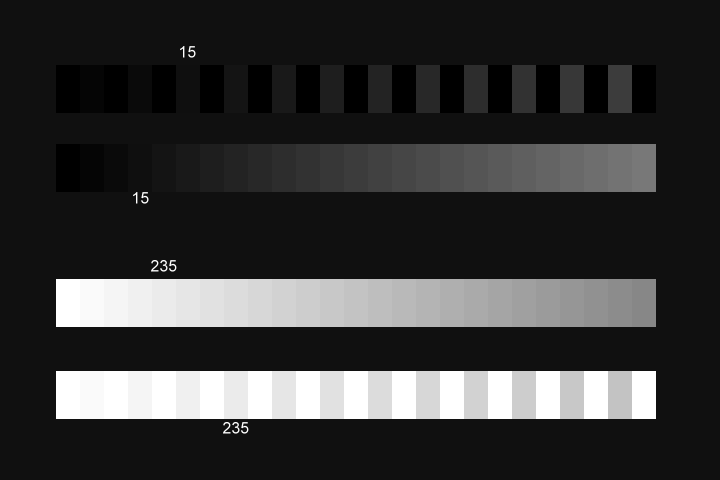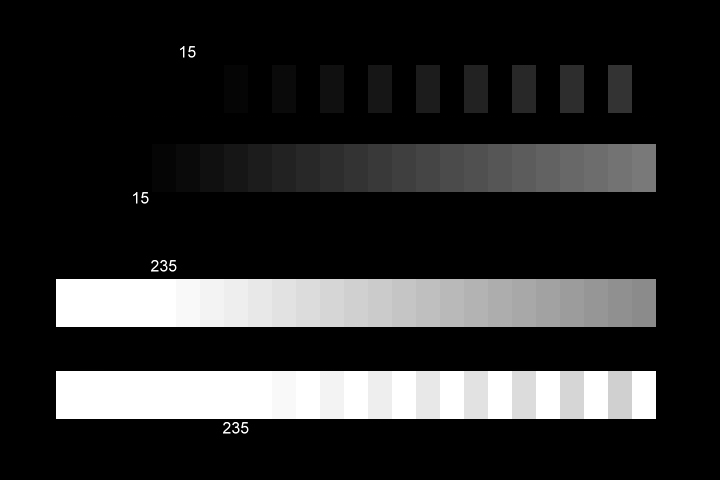 The gray boxes at 15 and below should all be perfectly black. You should not be able to distinguish between them. The boxes from 235 on up should be perfectly white. You should not be able to distinguish between them.