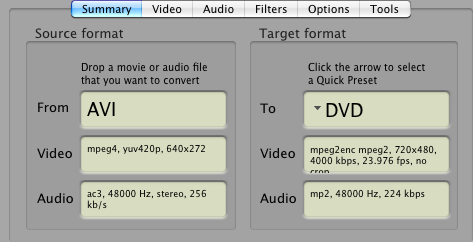 3. I'm having a similar problem. Video conversion works perfectly. I'm converting a DivX AVI to DVD, Using DVD (mpeg2enc) and all default settings. The only setting I'm changing is the size from DVD to DVD 16:9. The resulting DVD folder plays perfectly in VLC, but hangs OS X DVD Player. Is this normal for encodes from ffmpeg? I'm just curious before I waste a disc to see if it works in a stand alone player.