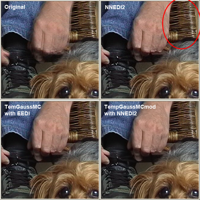 This is a 100% crop of my father tying his shoe laces, so there’s deinterlacing involved with the moving hand, but it also gives me a chance to test for detail retention in the rest of the image, particularly the cane chair. And this is where NNEDI2 on its own really does show its shortcomings. As you can see where I’ve circled in red, it really does make a mess of the cane chair detail compared to the original. TempGaussMC and TempGaussMCMod have no such problems.