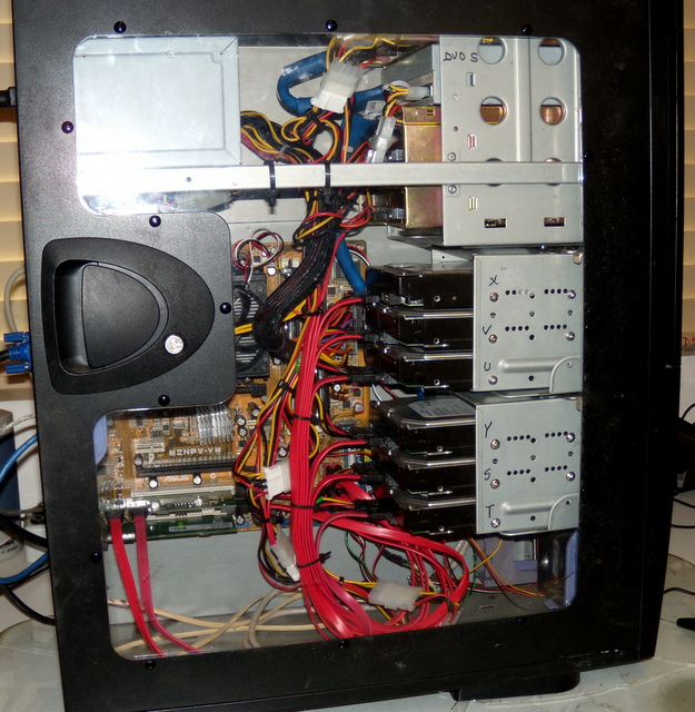 Same case with the side cover removed. It does cool quite well with five 80mm fans. But a bit noisy. Being a tall case, I also had to use longer SATA cables for some of the drives.