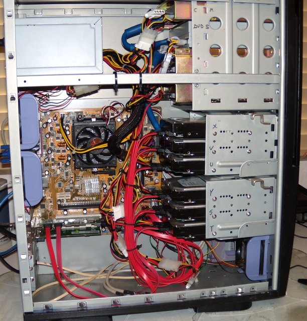 The drives pulled out and stacked. The HDDs to the right are in 5.25>3.5" adapter trays. Each tray has two 40mm fans, part of the noise problem as more than half of them failed and were fairly noisy when they worked.Also shown is the PATA DVD ROM drive. The boot drive is also PATA, a 80GB Maxtor which works fine for this application. The motherboard has four on-board SATA connectors and I added a PCI four SATA connector card. The other PCI slot is taken up by a Intel Gigabit LAN card.