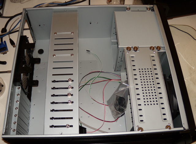 Top view. The brace across the center has hold downs for the PCI cards, but I won't use them. There is also a two bay 3.5" drive box attached to the brace. Won't need that either.