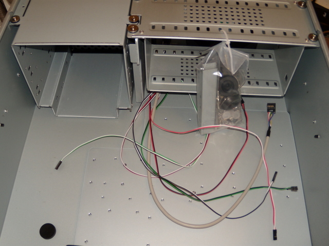 Case fans and drive bays mounted and wired. I used latching 10" SATA cables for the short runs and 18" and 24" for the longer runs. The PATA cable is a 18". I did add three SATA power splitters to operate all the drives. Excess PS cables are stuffed between the bottom HDD and the boot HDD. Some are also shoved to the side of the 5.25" bay. A modular PS would have made this a bit easier.