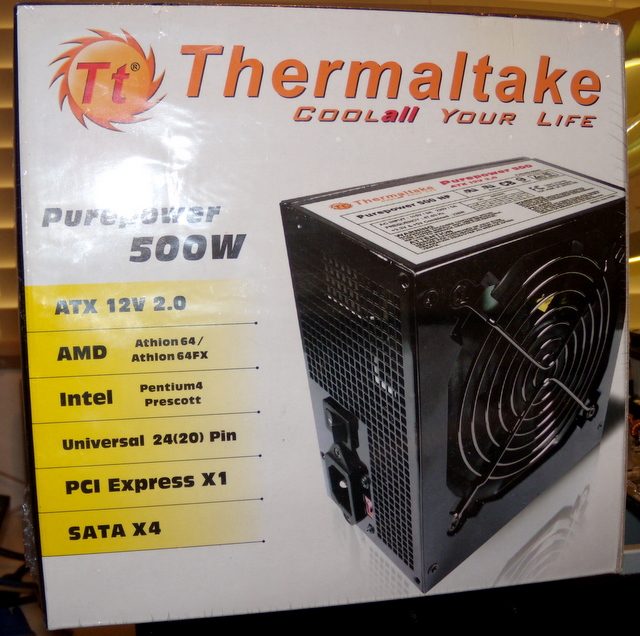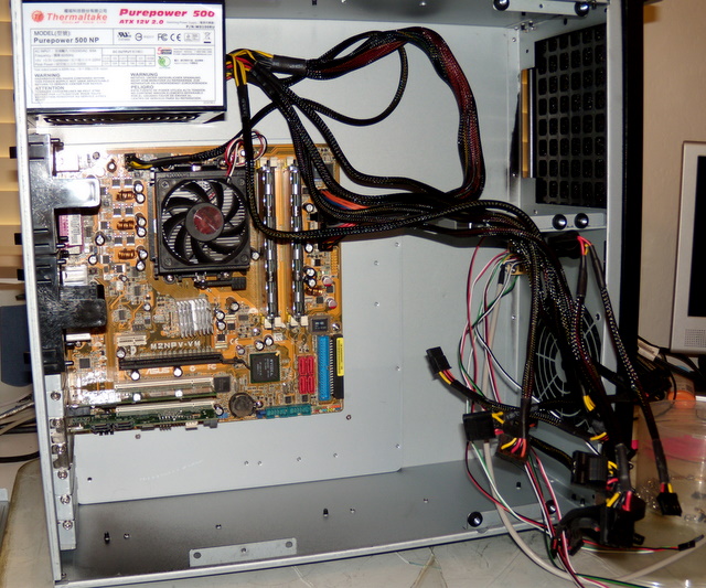 I decided to upgrade the PS with this spare 500W Thermaltake I had laying around. The original PS was a 430W Coolermaster and was more than sufficient to supply the power for the server. It ran fairly cool, but with my WOL problem, I wasn't sure it was supplying enough standby power.