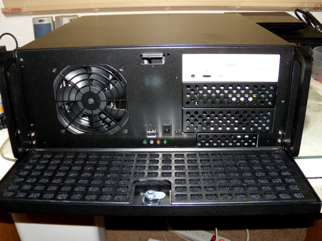 The front cover open. The indicator lights, from right to left are, Power, HDD Activity, Fan Fail indicator, and LAN activity. I didn't hook up the last two. There is also two USB ports and a rocker switch for power and reset.