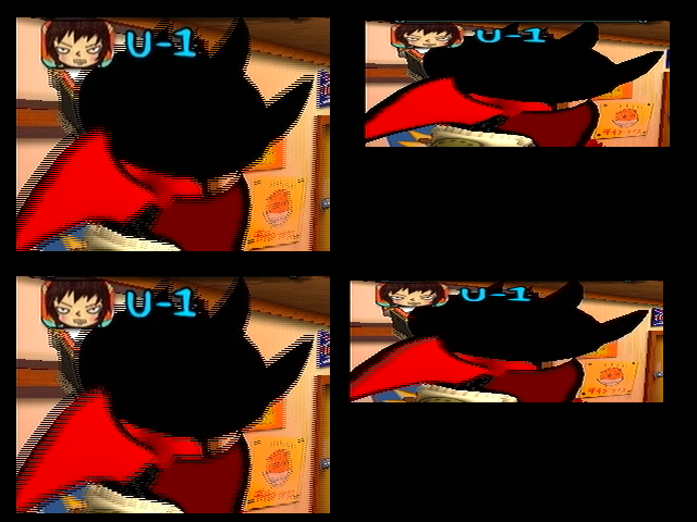 On the bottom left is a crop showing VirtualDub's improper handling of interlaced YV12. The red and black comb lines are no longer nice alternating, 1 line thick, black and red lines. At the bottom right you can see that the discard field deinterlace does not leave a clean comb line free result.