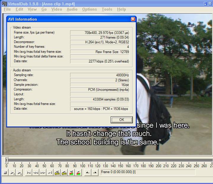 It says 29.97 fps when I open the "Anno clip 1.mp4" you supplied a while back. What frame size does it say? I get 708x480: