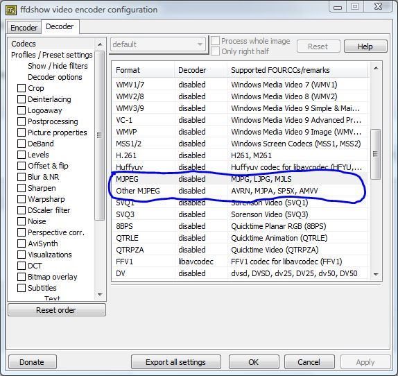 Scroll down in the right-hand pane of either window until you find the MJPEG and Other MJPEG entries (under the Format column). For the Decoder column, do they have "disabled" listed, or are they set to "libavcodec"?