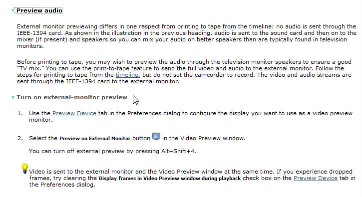 Hello, can somebody help me how to preview my project video from the timeline to an external television. When I playback the video from the timeline, I want to see it full screen on my external TV like watching the final output, do i need to connect my PC to a VCR or DVD recorder? Can somebody help me on this? Thanks. citizen_2764@yahoo.com