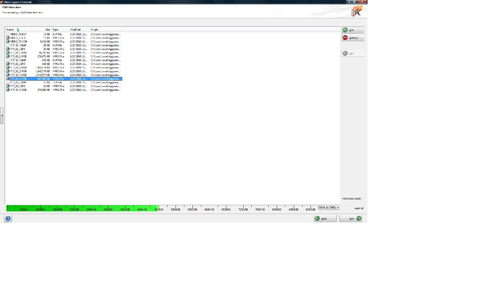 To burn you files to a DVD, first locate them, for this I am using Nero Essentials, click add and then add all the files in the video_ts folder, then click "next", then choose your dvd burner if it's not listed, and click "burn". Almost all the software I encounter is much the same. If you just want to play the vobs files you should be able to do so using windows media player, divx player, power dvd, and others. If you have a linear editor such as vegas movie studio, you can just import the vob files right onto the time line for editing. Is there something else you are more interested in doing? -