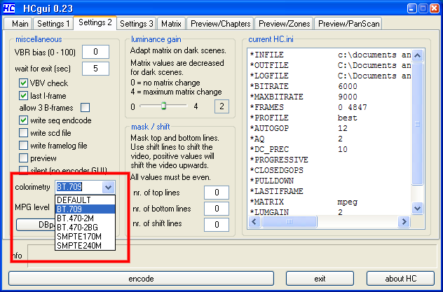 The vast majority of the DVDs I see (a lot) are undeclared, with a few SMPTE 170M and even fewer BT.470-2. Unless you change the colorimetry when going from Hi-Def to DVD, or unless you specifically set it for BT.709 in the encoder, your colors will change. And I suspect that even if you do set it for BT.709, many players won't honor the flag. And encoders such as CCE don't even allow you to set the flag, so it'll be decoded as BT.601, changing the colors if the source was Hi-Def unless you use the ColorMatrix or BT709ToBT601 filters to change it.Colorimetry - Displays the colorimetry scheme used by the stream. Note that if the stream does not declare the colorimetry, then ITU-R BT.709* is reported for HD video, and ITU-R BT.470-2* is reported for SD video. The * character indicates that the stream did not declare the colorimetry.Last edited by manono; 5th Mar 2010 at 19:56.