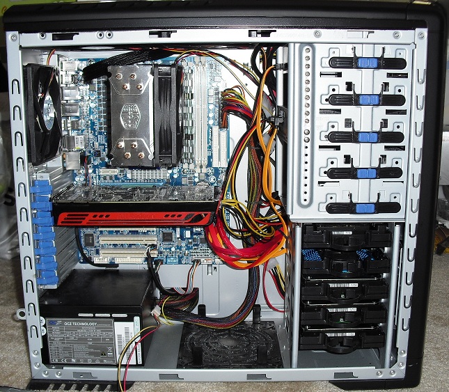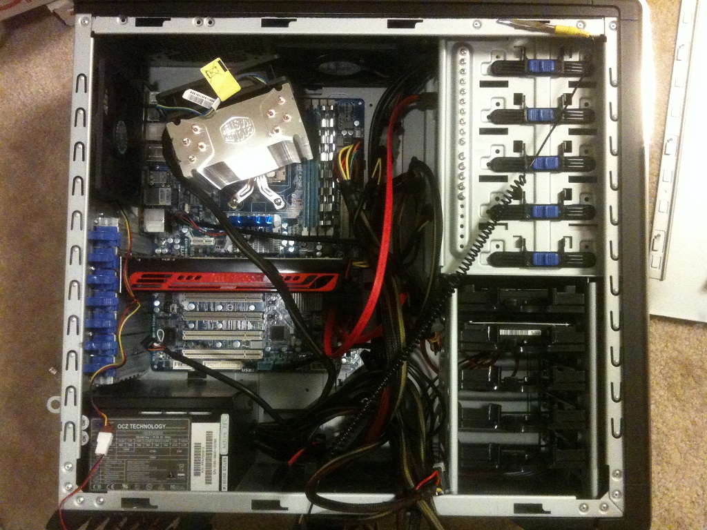 ^^^^Hey! good to hear you got your build up and running. Dude you need to do some cable management. Run the all the hardware cables behind the motherboard and your pc will look much cleaner and have even better system temps. You can run the 8pin power supply cable through the top slot that's behind the motherboard. Take a look at the CM 690 Club thread at overclock.net. You can get a idea of how the cables are run behind the motherboard by using zip ties and cable mounts. Once the cables are behind the motherboard it may take some strength to slide the case cover on but in the long run you'll have better airflow in there.