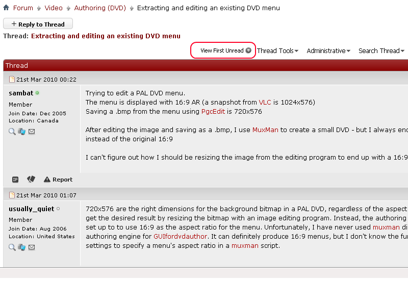 Since you're using V-Bulletin now, can you add the 'View First Unread' button to the first post header like this one: