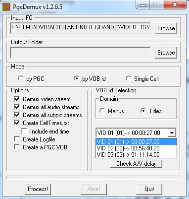 When I selected "by VOB" it gave me the VOB ID#1 as 61 minutes. When I selected "by PGC" it gave me the correct time in the right dropdown of 1:45 (the correct time of the full movie) BUT after processing "by PGC" the final demuxed file (both audio\video\celltimes & subs) all came to only 61 min.