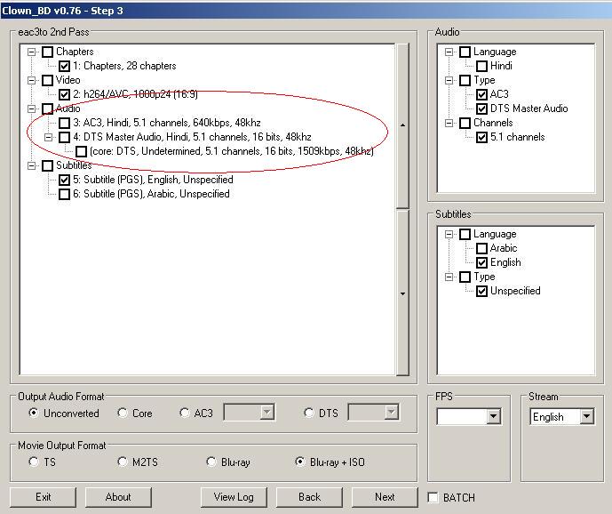 Yes, you have to select an audio stream. If you want the DTS stream, I suggest you select "Core" for "Output Audio Format". If you want the AC3 stream, select "Unconverted". If for some reason either of these doesn't give you a good stream (it happens, particularly if there are any bad frames in the file), then output as AC3, either 640 or 448 kbps. Save as Blu-Ray.