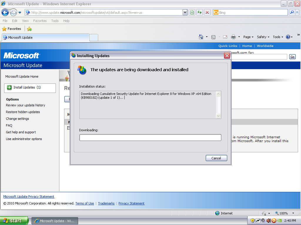 You have to have ActiveX enabled in order to use Windows Update, you can also go here to download manually: