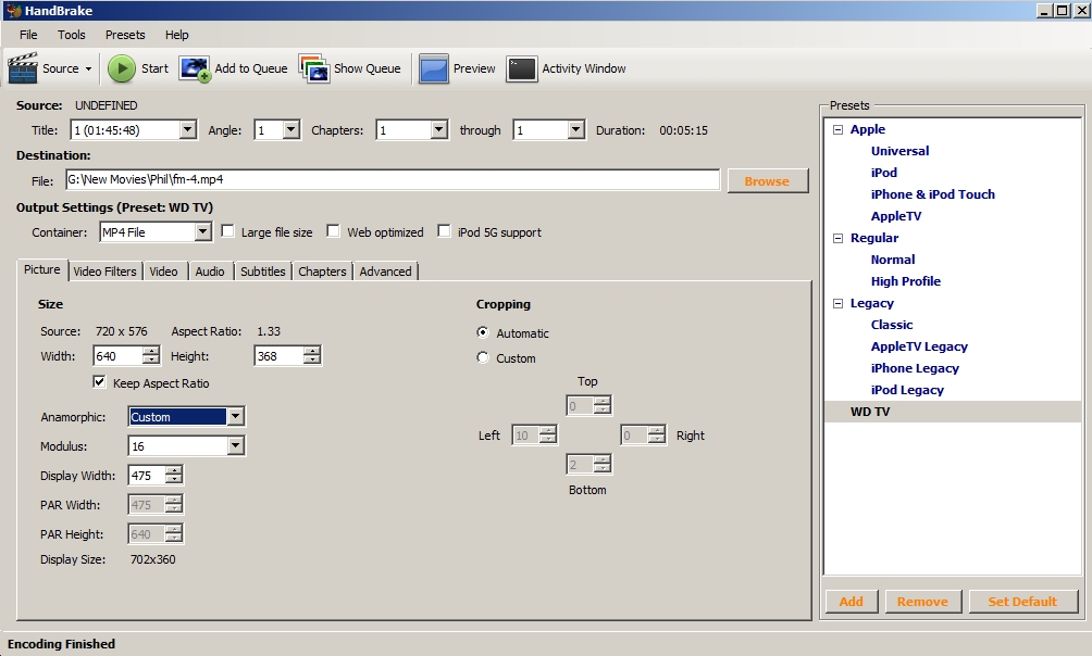 I read here somewhere about Handbrake, and have been using this. Some DVD's when watched on my plasma are different when converted to MP4 H264 and played via WD TV. The files when played have borders on the sides and images are squashed up, looking taller and thinner than what they perhaps should be.