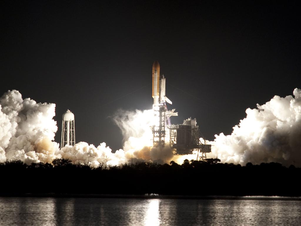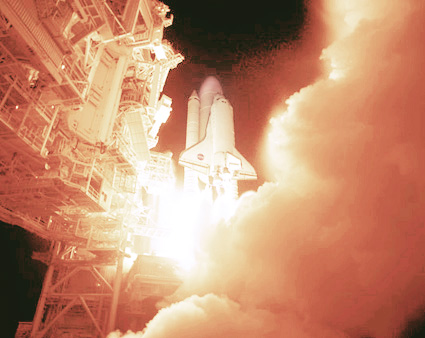 About what the launch looked like reflected against the launch tower. Very bright and very hot. A NASA picture photoshoped to look similar to what I saw, but I couldn't get the orange color right.