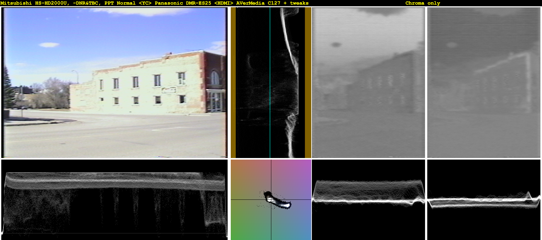 The HDMI capture has been reinterlaced from 480p. The two DMR-ES25 captures were done at the same time; all others were done while replaying the tape at different times.
