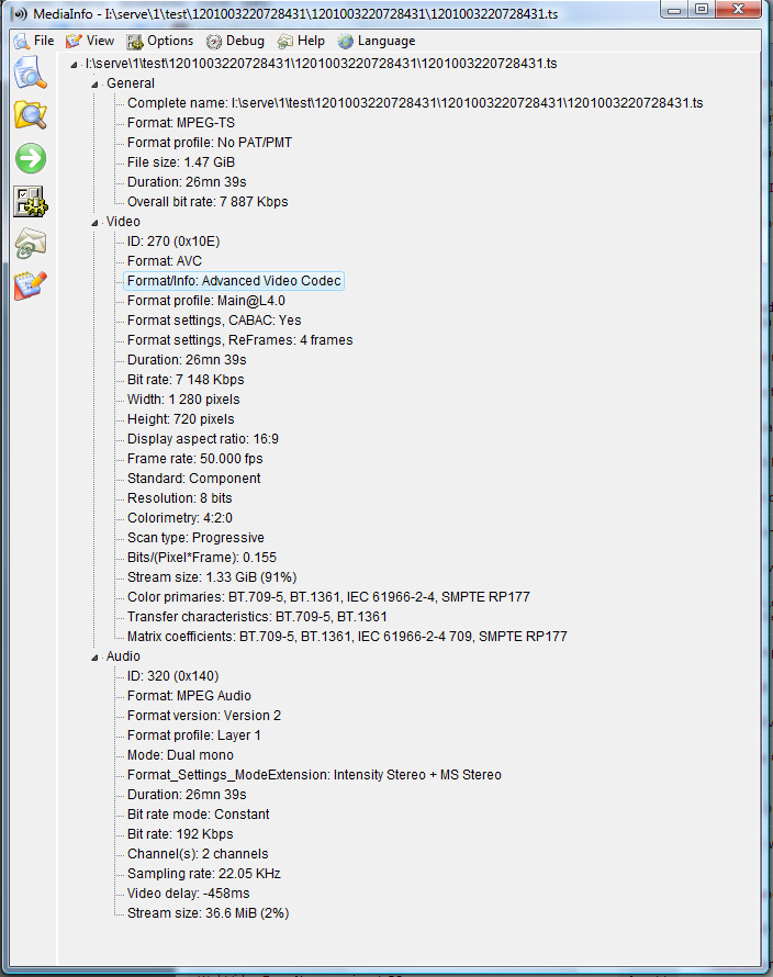 - The video stream is 7,148 Kbps 1280*720 (16:9), at 50.000 fps, AVC (Component) (Main@L4.0) (CABAC /4 Ref Frames).