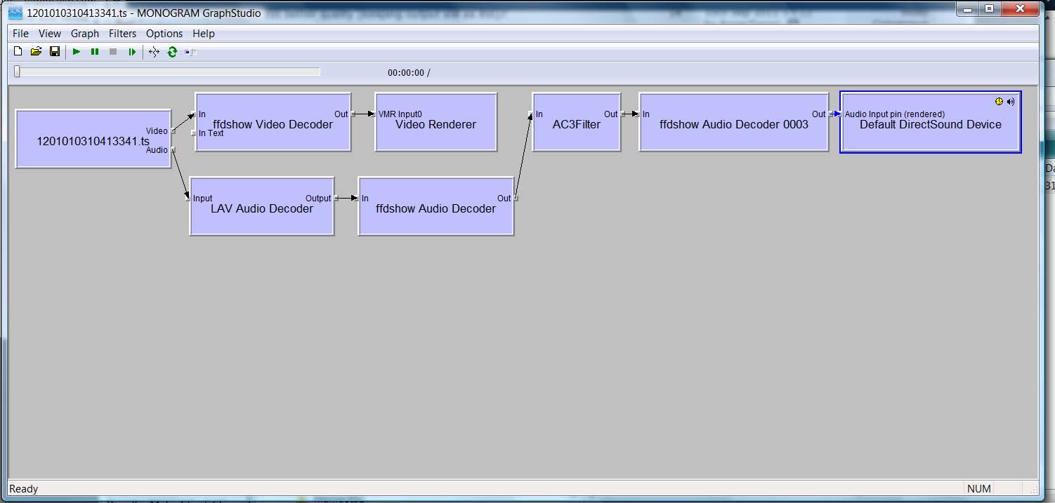 Delete the last renderer box (DirectSound Device), and everything after lav audio decoder as well as the entire video chain for the audio.grf . It should just show the 1st box and lav audio decoder with empty output pin