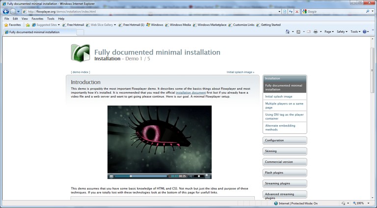 The example that flowplayer provides work on IE but everytime I use that code outside of the example page or on my own webpage is doesn't work on IE8. The player would load up the video doesn't load or run when I use the code outside of the example page. -