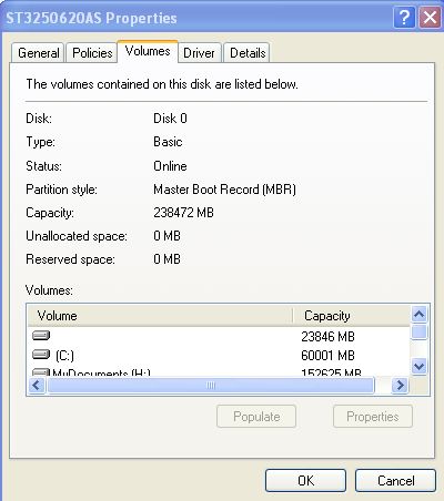 Nelson37: My Main Drive is partition into three parts and I think I can prove it by right clicking each partition and selecting properties, when I pick the hardware tab it reveals they are all listed under "ST3250620AS". The partitions are "C: Local Drive" which is 58.5 GB, "H: My Documents" which is 149 GB, and "P: Page File" which is 1.95 GB. It seems my original drive is around 200 GB. I just went to "Device Manager" and found out something very interesting there is another partition that has no name and it is about 24 GB and it is listed before the "C