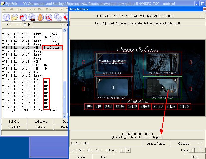 (Basically it seems that all the chapters now just go to the beginning and I don't see where to change them - it's obviously possible in PgcEdit, but I don't see the commands - all the chapter Targets are set to the beginning of the main video)