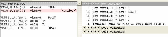 I think this a common error and if you could explain how to fix it you'd be helping not only myself, but many other users.Code:Calls cross references DVD: \"H:/Testes/VIDEO_TS\" DVD-TEXT General Name: \"\" Provider ID: \"MEDIACHANCE-DVDLAB-PRO2\" Number of VTS: 1 ################################ First-Play PGC ################################ VMG , First-Play PGC : Entry PGC. ##################################### VMGM ##################################### VMGM , LU 1 (en) , 1 (dummy) TitleM: Callable with remote control TitleMenu button. VMGM , LU 1 (en) , 2 (0:01): *** Uncalled from commands! *** #################################### VTSM 1 #################################### VTSM 1 , LU 1 (en) , 1 (dummy) RootM: Callable with remote control RootMenu button. VTST 1 , 1 TTN 1 (0:28) Title 1, POST command 2: (CallSS) Call the VTSM Root menu of the current VTS, resume cell 1 VTSM 1 , LU 1 (en) , 2 (0:00) 4b.: VTSM 1 , LU 1 (en) , 1 (dummy) RootM, pre command 3: if ( gprm(12) != 65535 ) then { LinkPGCN PGC 2 } VTSM 1 , LU 1 (en) , 1 (dummy) RootM, pre command 5: LinkPGCN PGC 2 VTSM 1 , LU 1 (en) , 2 (0:00) 4b., post command 2: LinkPGCN PGC 2 VTSM 1 , LU 1 (en) , 3 (0:03) 7b., cell 1, group 1, button 2: LinkPGCN PGC 2 VTSM 1 , LU 1 (en) , 3 (0:03) 7b.: VTSM 1 , LU 1 (en) , 2 (0:00) 4b., cell 1, group 1, button 4: LinkPGCN PGC 3 VTSM 1 , LU 1 (en) , 3 (0:03) 7b., post command 2: LinkPGCN PGC 3 #################################### VTST 1 #################################### VTST 1 , 1 TTN 1 (0:28) Title 1: VMGM , LU 1 (en) , 1 (dummy) TitleM, pre command 3: (JumpTT) Jump to Title 1 VMG , First-Play PGC , pre command 5: (JumpTT) Jump to Title 1 VTSM 1 , LU 1 (en) , 2 (0:00) 4b., cell 1, group 1, button 1: (JumpVTS_PTT) Jump to TTN 1, Chapter 1 VTSM 1 , LU 1 (en) , 2 (0:00) 4b., cell 1, group 1, button 2: (JumpVTS_PTT) Jump to TTN 1, Chapter 1 VTSM 1 , LU 1 (en) , 2 (0:00) 4b., cell 1, group 1, button 3: (JumpVTS_PTT) Jump to TTN 1, Chapter 4 VTSM 1 , LU 1 (en) , 3 (0:03) 7b., cell 1, group 1, button 1: (JumpVTS_PTT) Jump to TTN 1, Chapter 1 VTSM 1 , LU 1 (en) , 3 (0:03) 7b., cell 1, group 1, button 3: (JumpVTS_PTT) Jump to TTN 1, Chapter 2 VTSM 1 , LU 1 (en) , 3 (0:03) 7b., cell 1, group 1, button 4: (JumpVTS_PTT) Jump to TTN 1, Chapter 3 VTSM 1 , LU 1 (en) , 3 (0:03) 7b., cell 1, group 1, button 5: (JumpVTS_PTT) Jump to TTN 1, Chapter 4 VTSM 1 , LU 1 (en) , 3 (0:03) 7b., cell 1, group 1, button 6: (JumpVTS_PTT) Jump to TTN 1, Chapter 5 VTSM 1 , LU 1 (en) , 3 (0:03) 7b., cell 1, group 1, button 7: (JumpVTS_PTT) Jump to TTN 1, Chapter 6 ################################## Uncalled PGCs ################################# VMGM , LU 1 (en) , 2 (0:01) Found 1 uncalled PGCs. ############################### Jumps to nowhere! ############################## None.Last edited by jairovital; 17th Aug 2010 at 09:17.
